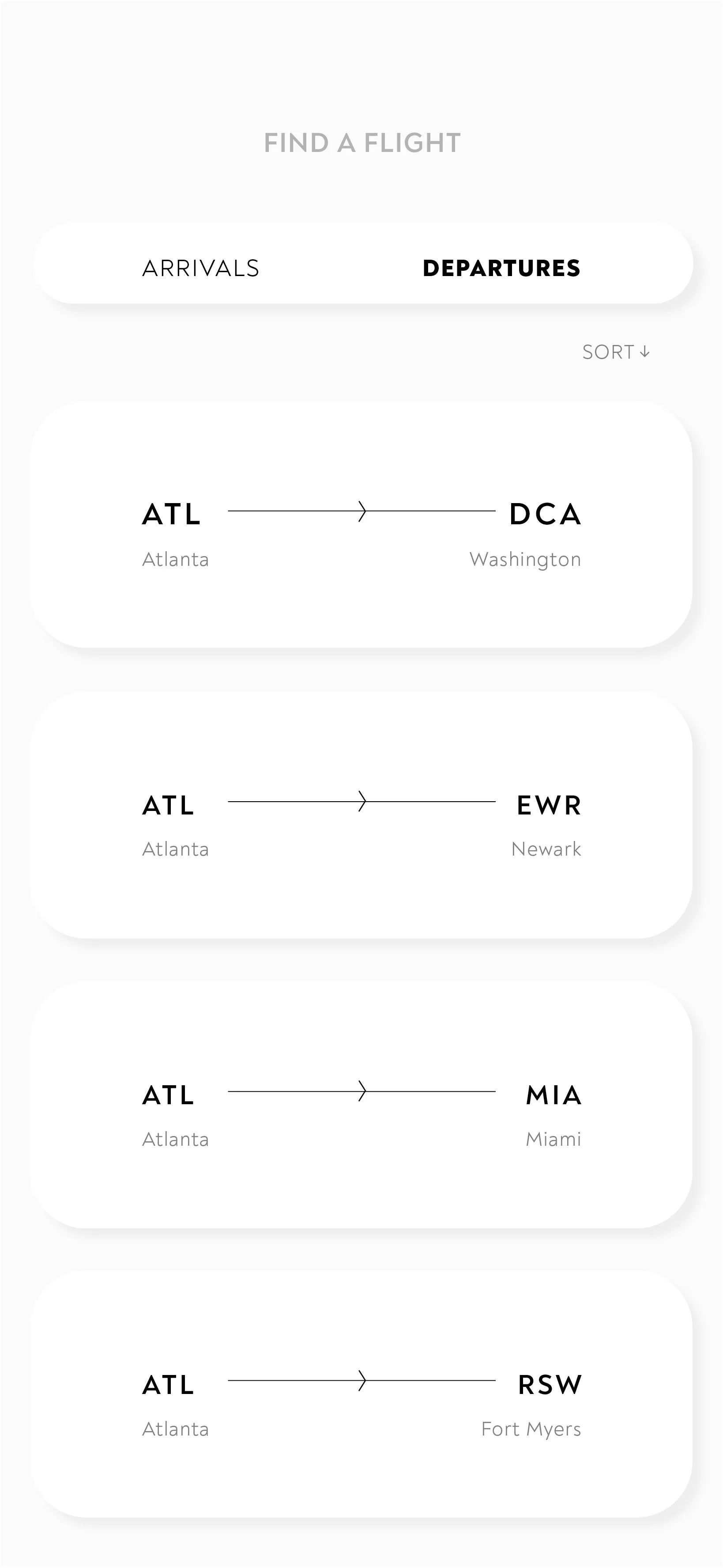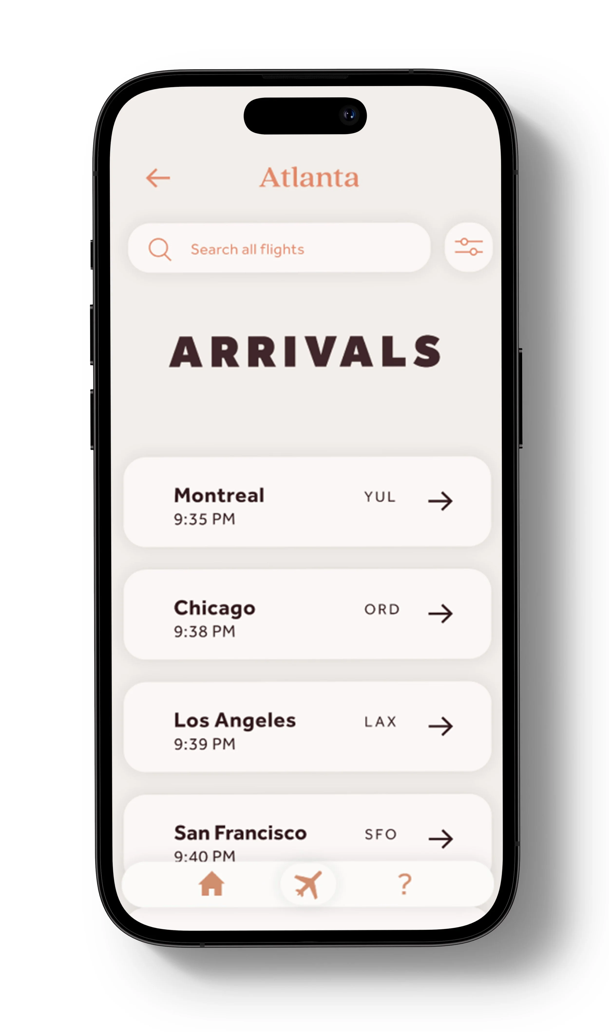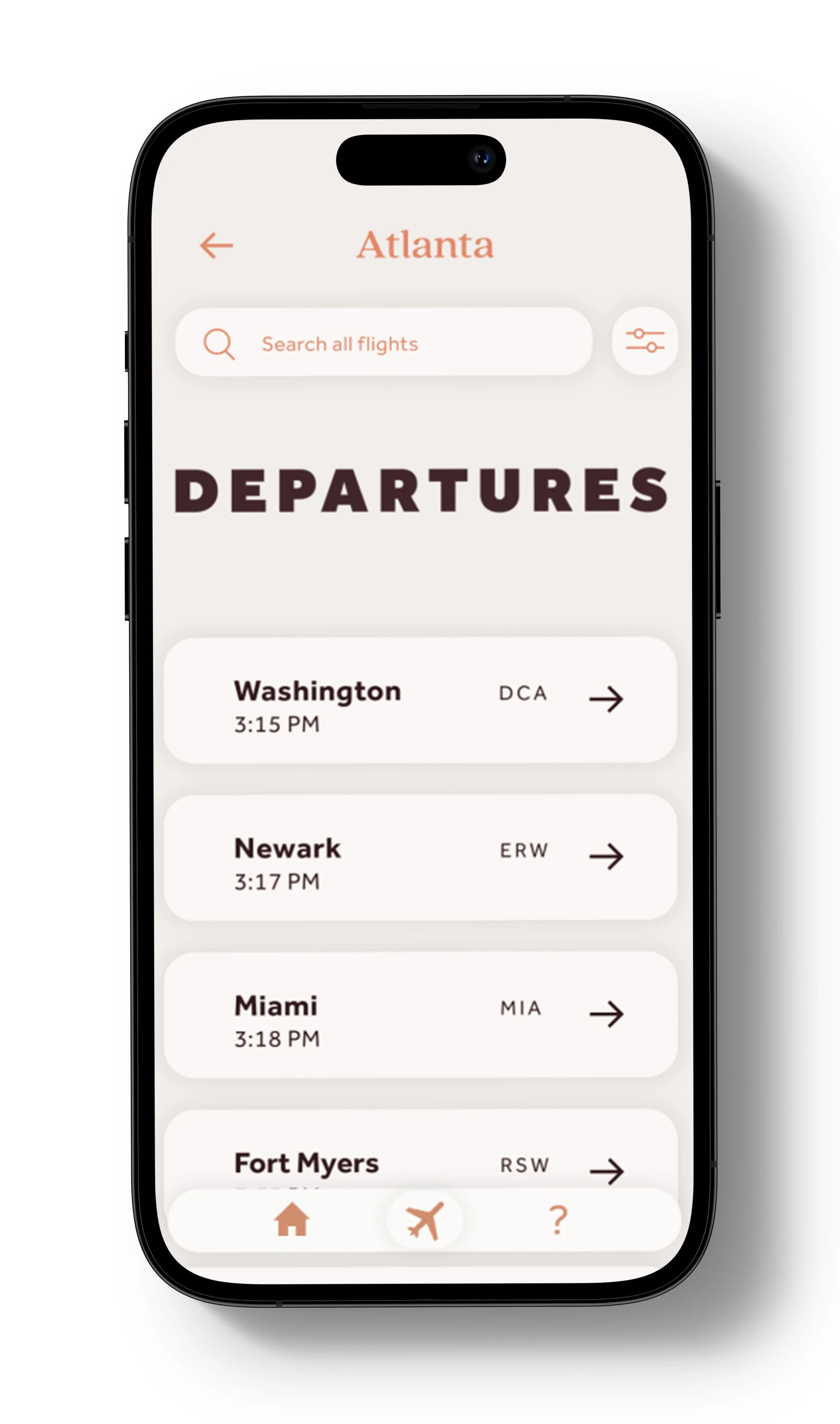 This project is a mobile app for arrivals and departures at Hartsfield-Jackson International Airport. The goal was to design a clear, organized flight information display that communicates real-time updates, using typography, hierarchy, and symbols to simplify complex data.